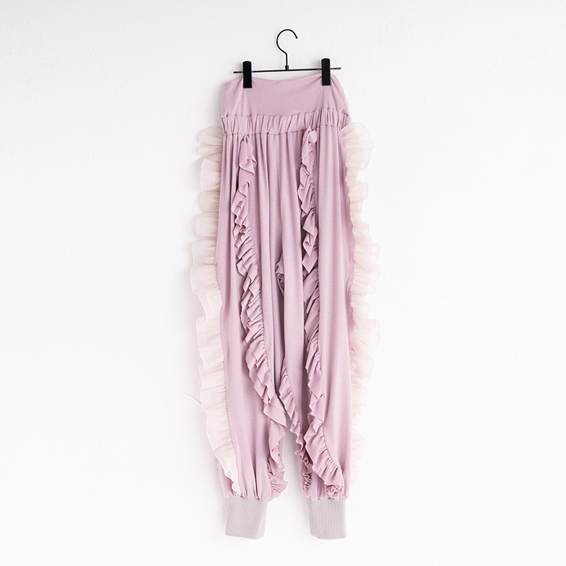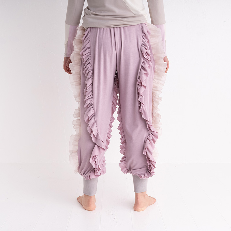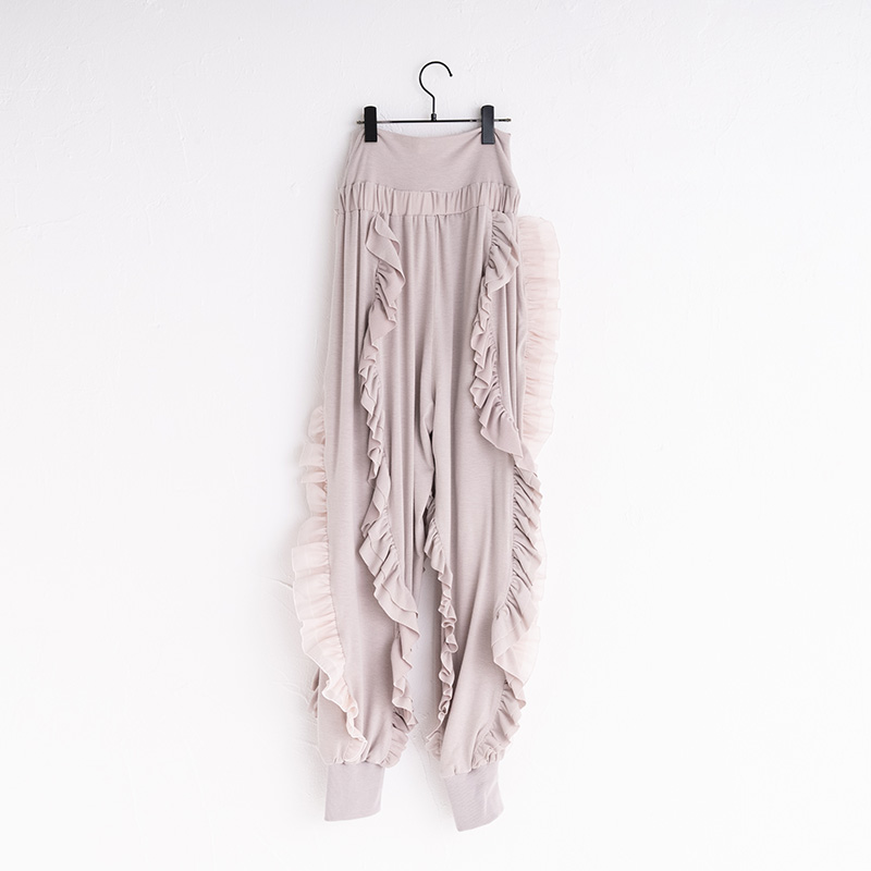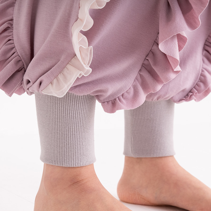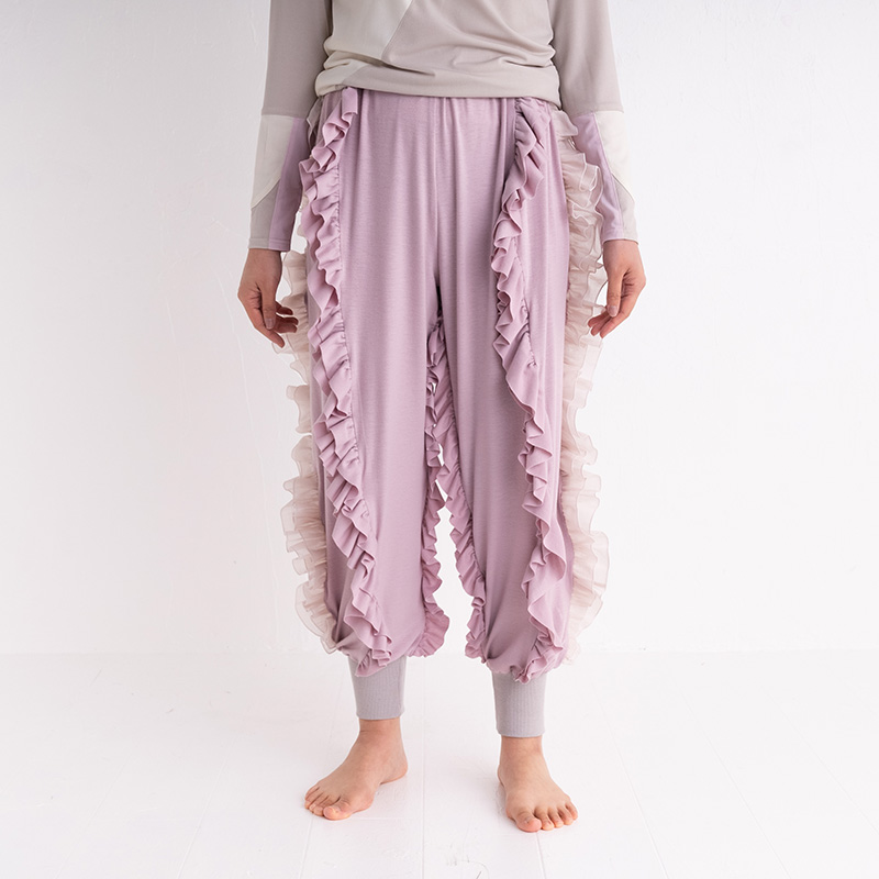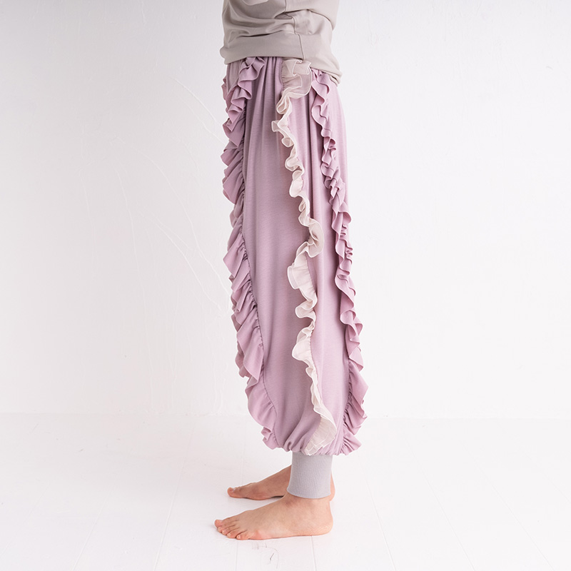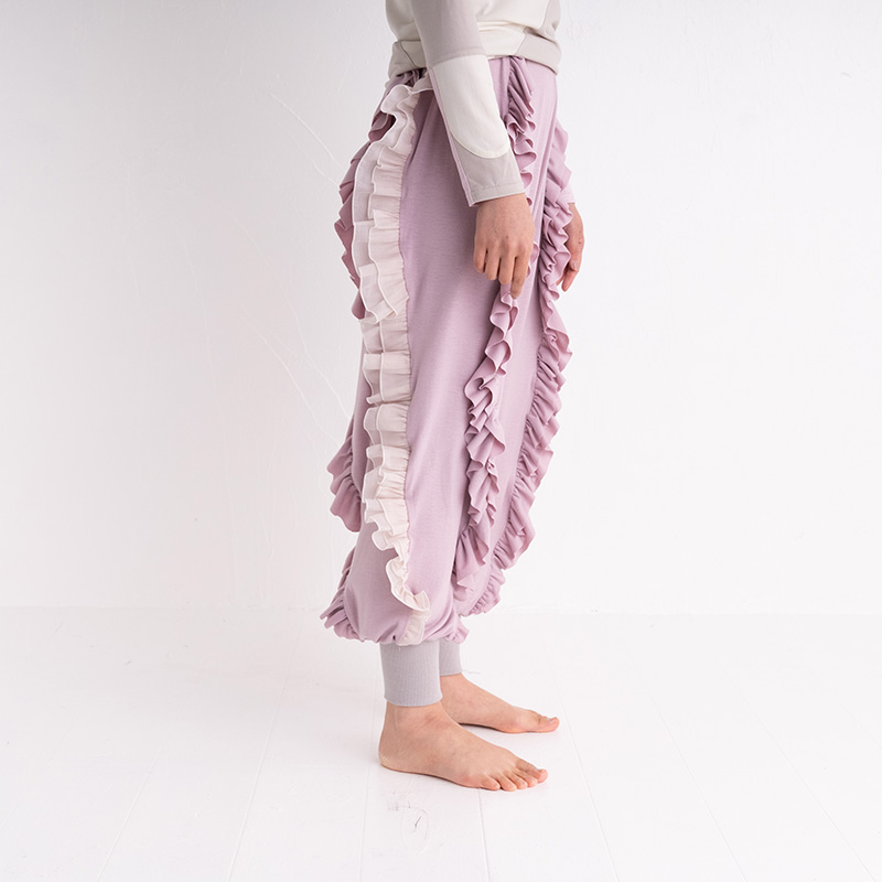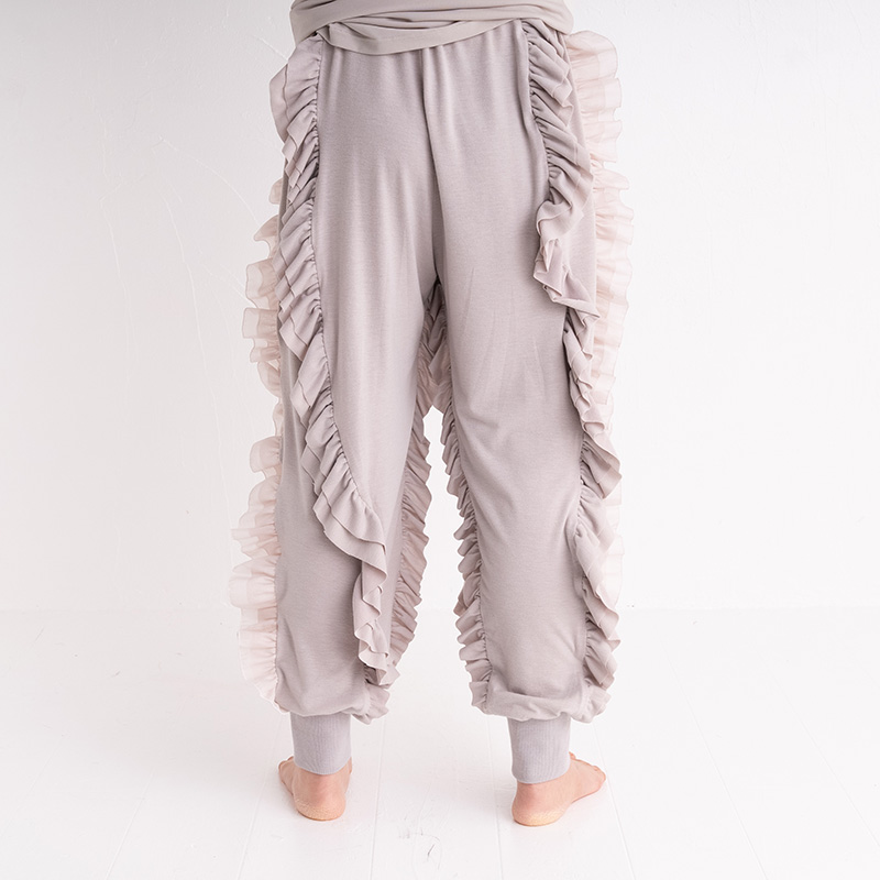 着心地の良いベア天竺のゆったりした丸いシルエットのフリルパンツです。センターやサイドにたっぷり施されたベア天竺とオーガンジーフリルがフェミニンで印象的です。裾を絞っているのでスッキリと見せてくれ、ロングTシャツやワンピースとのレイヤードも相性のいいパンツです。リラックスフリルTシャツとのセットアップもオススメです。ウエスト部分の幅広い生地が締め付けが少なくゆったりと快適にお過ごしいただけます。外出にも着用いただけるデザインとなっております。
