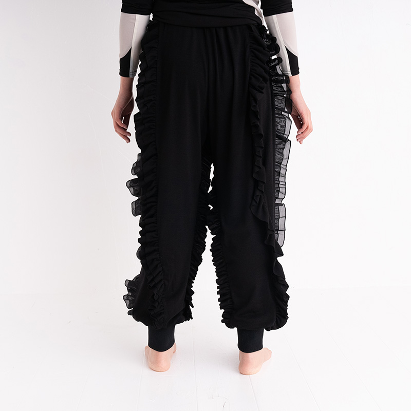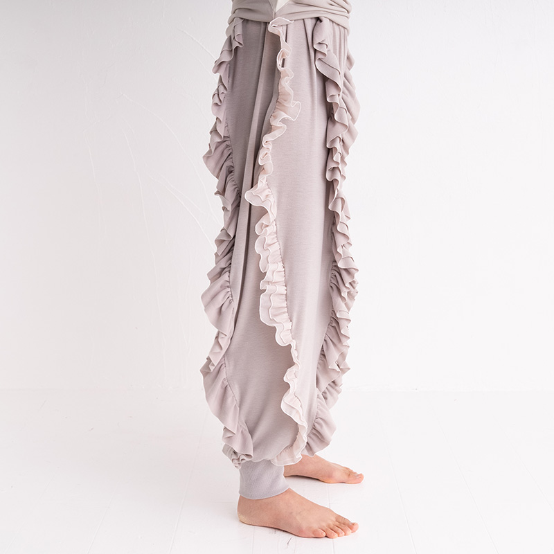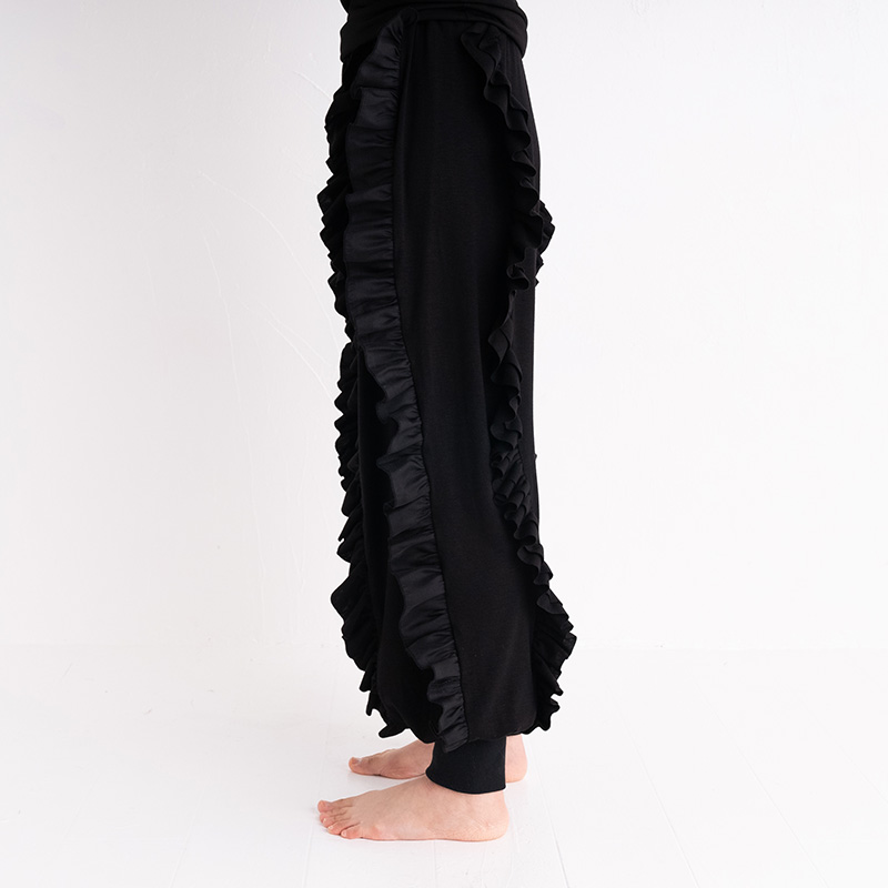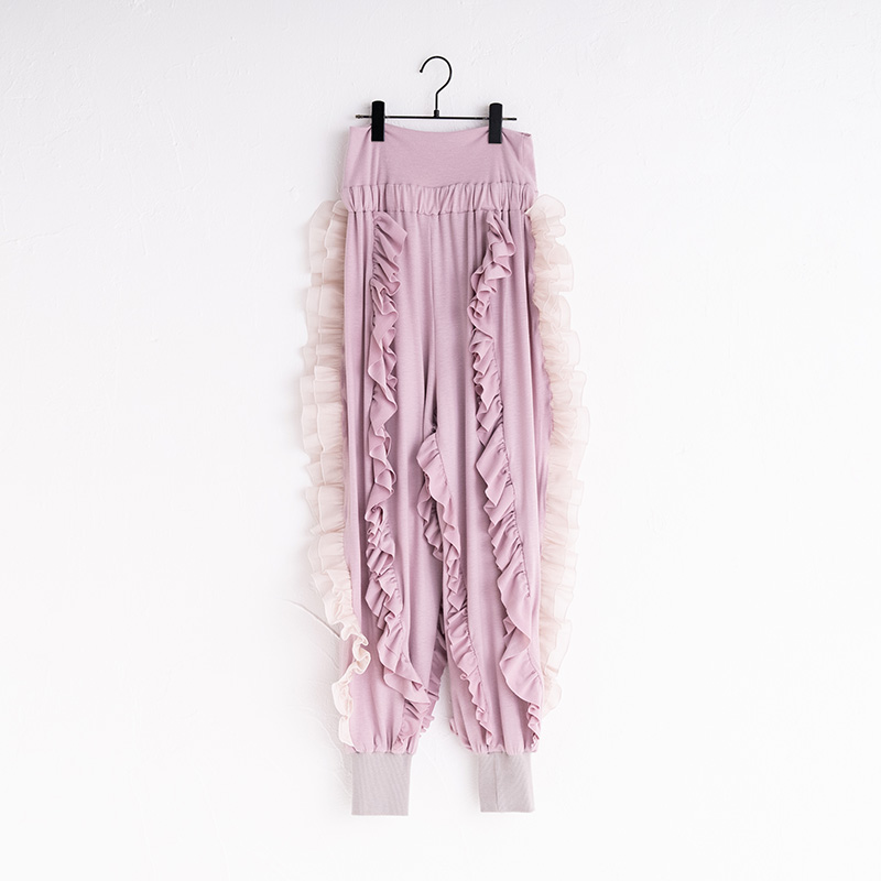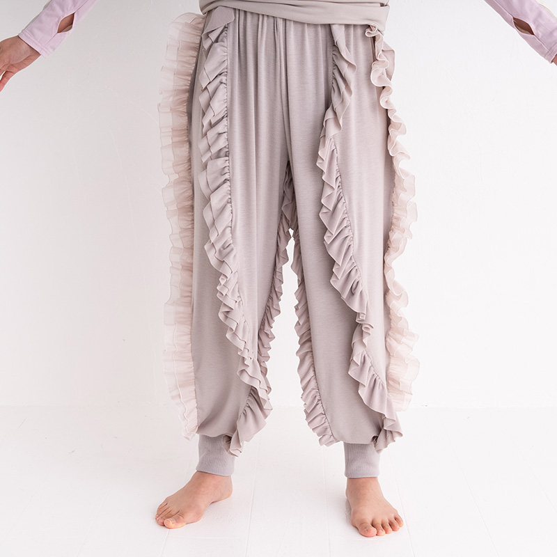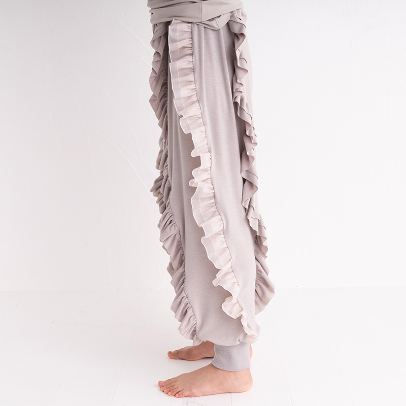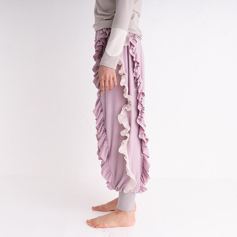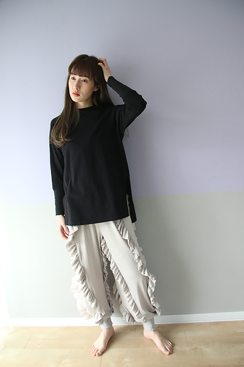 着心地の良いベア天竺のゆったりした丸いシルエットのフリルパンツです。センターやサイドにたっぷり施されたベア天竺とオーガンジーフリルがフェミニンで印象的です。裾を絞っているのでスッキリと見せてくれ、ロングTシャツやワンピースとのレイヤードも相性のいいパンツです。リラックスフリルTシャツとのセットアップもオススメです。ウエスト部分の幅広い生地が締め付けが少なくゆったりと快適にお過ごしいただけます。外出にも着用いただけるデザインとなっております。