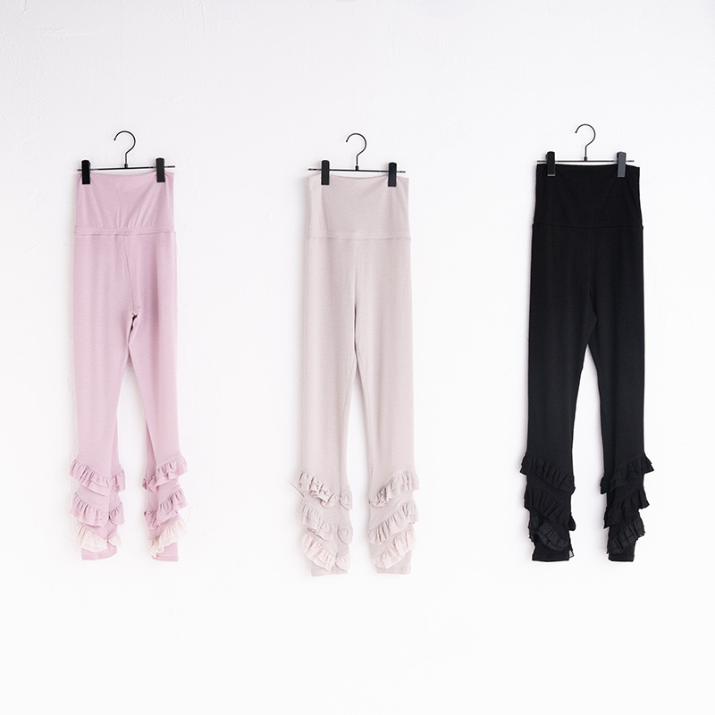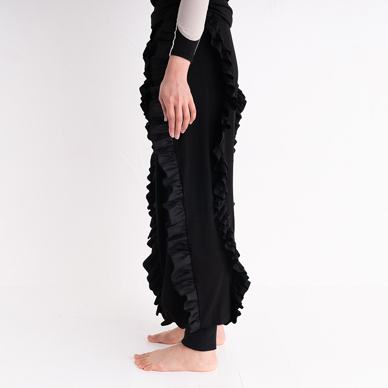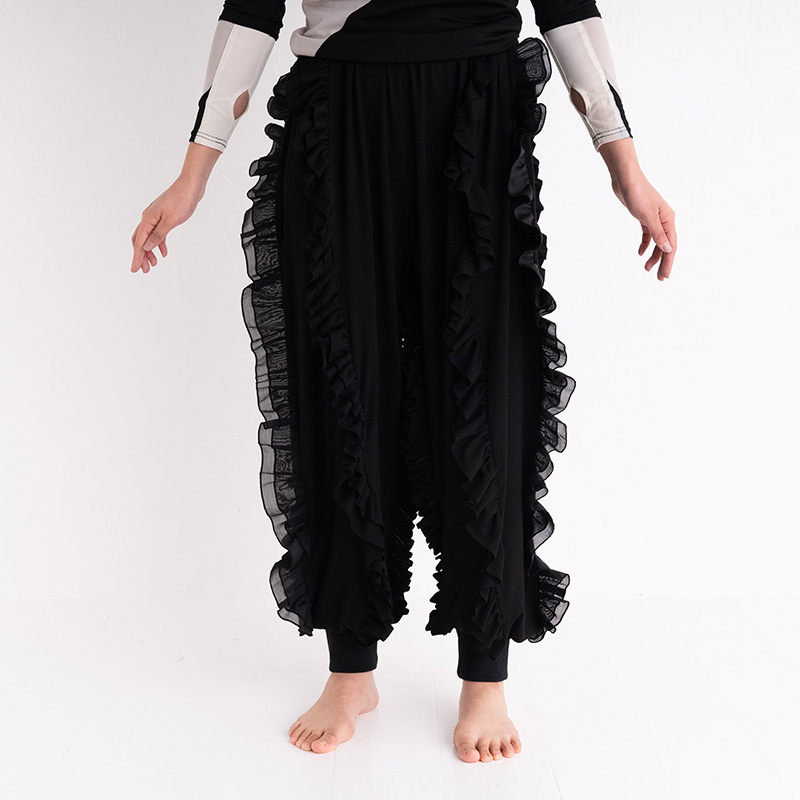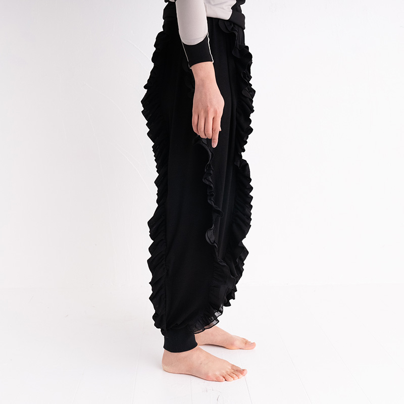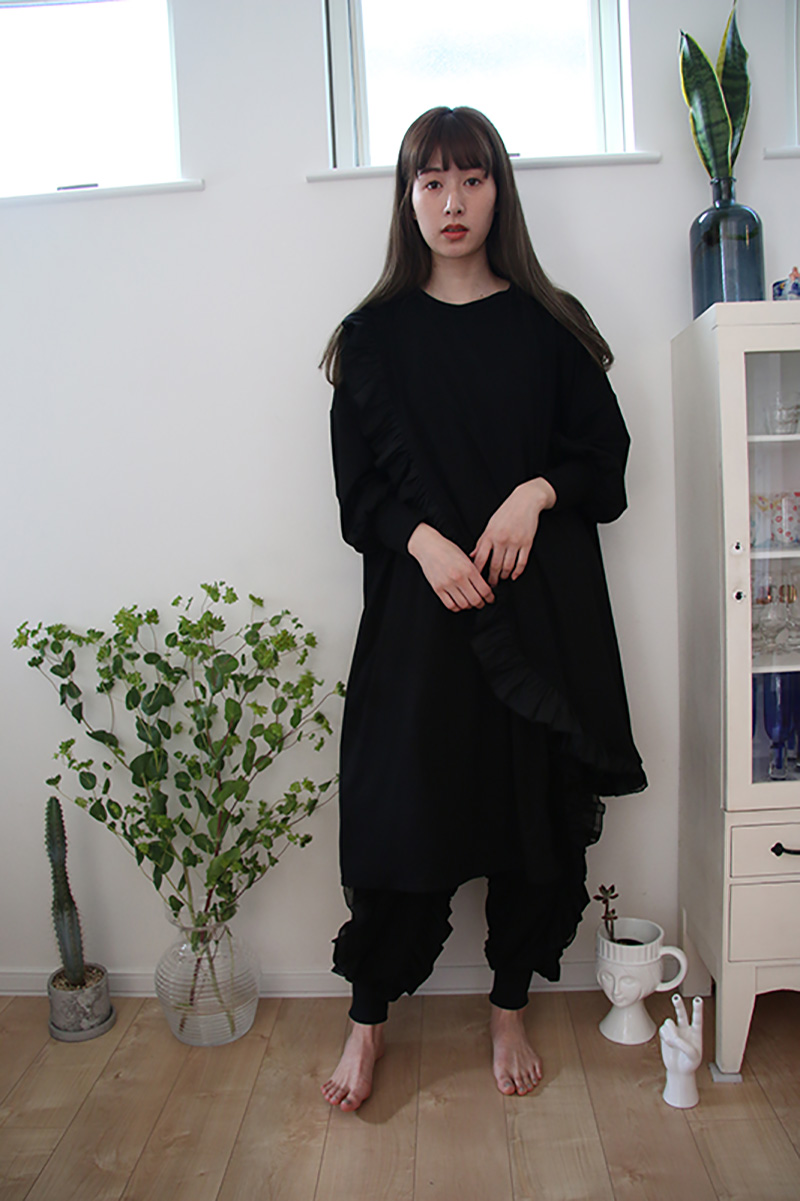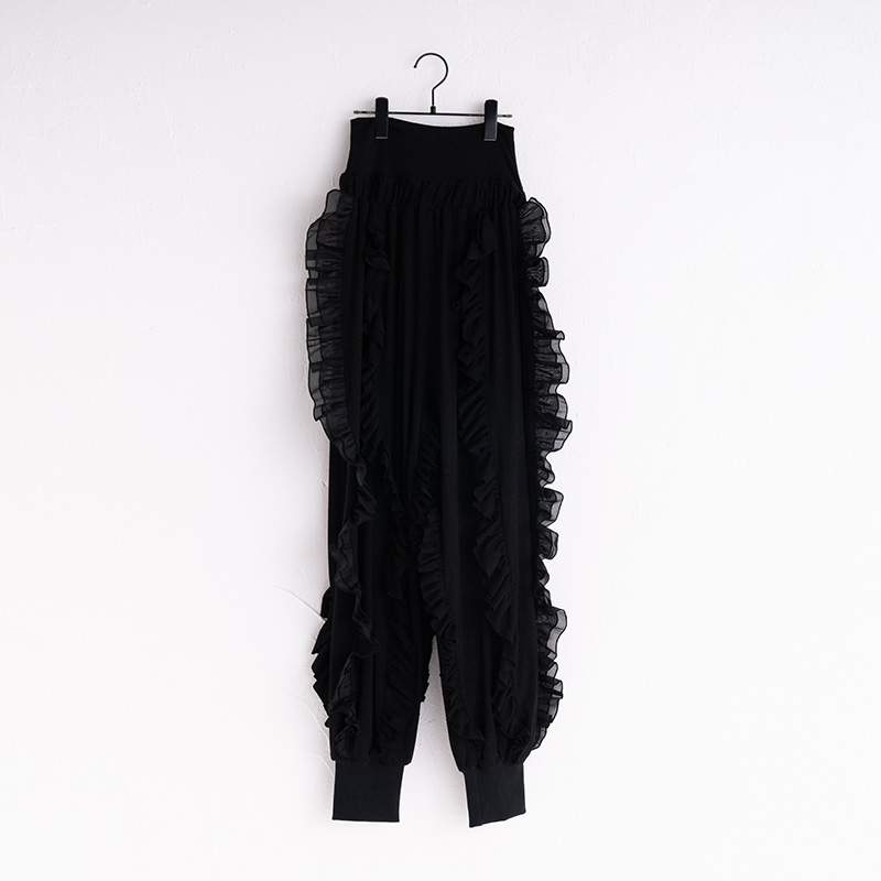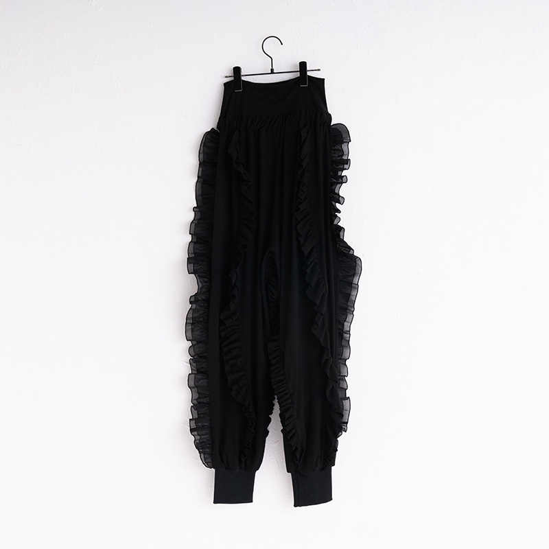 着心地の良いベア天竺のゆったりした丸いシルエットのフリルパンツです。センターやサイドにたっぷり施されたベア天竺とオーガンジーフリルがフェミニンで印象的です。裾を絞っているのでスッキリと見せてくれ、ロングTシャツやワンピースとのレイヤードも相性のいいパンツです。リラックスフリルTシャツとのセットアップもオススメです。ウエスト部分の幅広い生地が締め付けが少なくゆったりと快適にお過ごしいただけます。外出にも着用いただけるデザインとなっております。