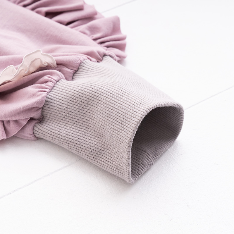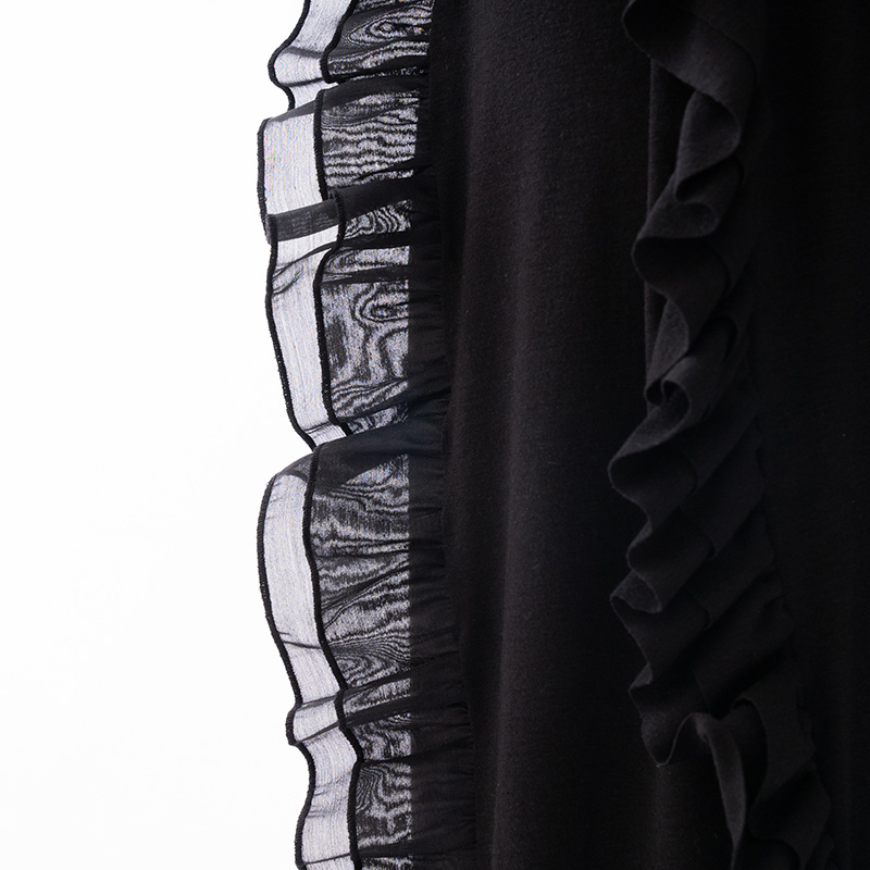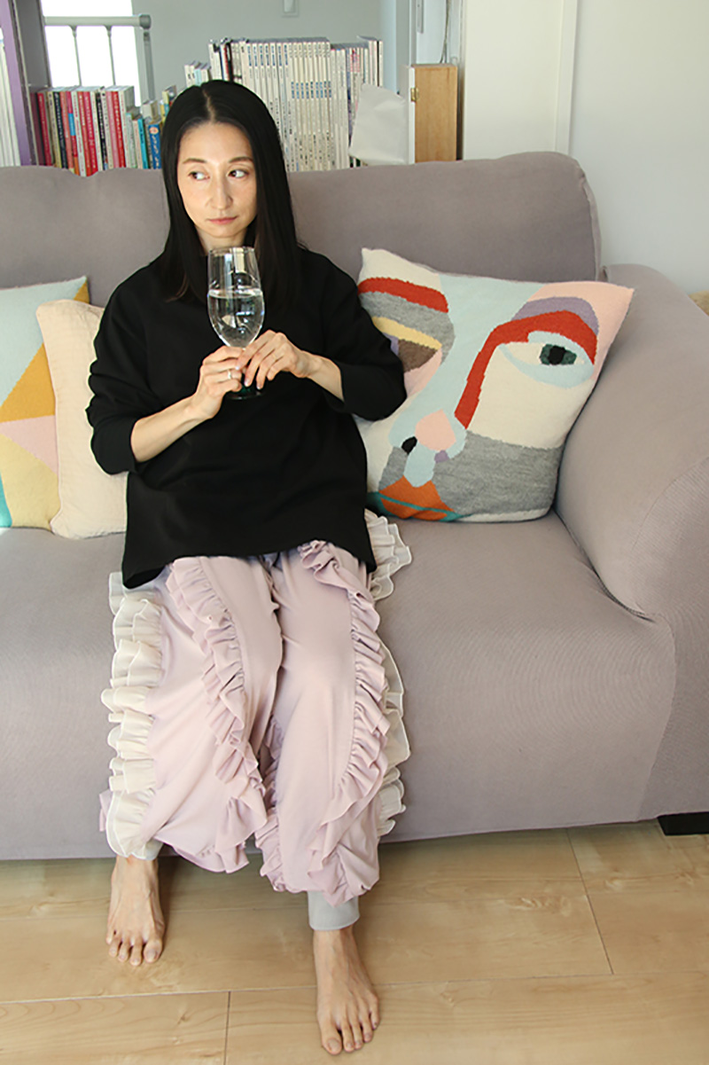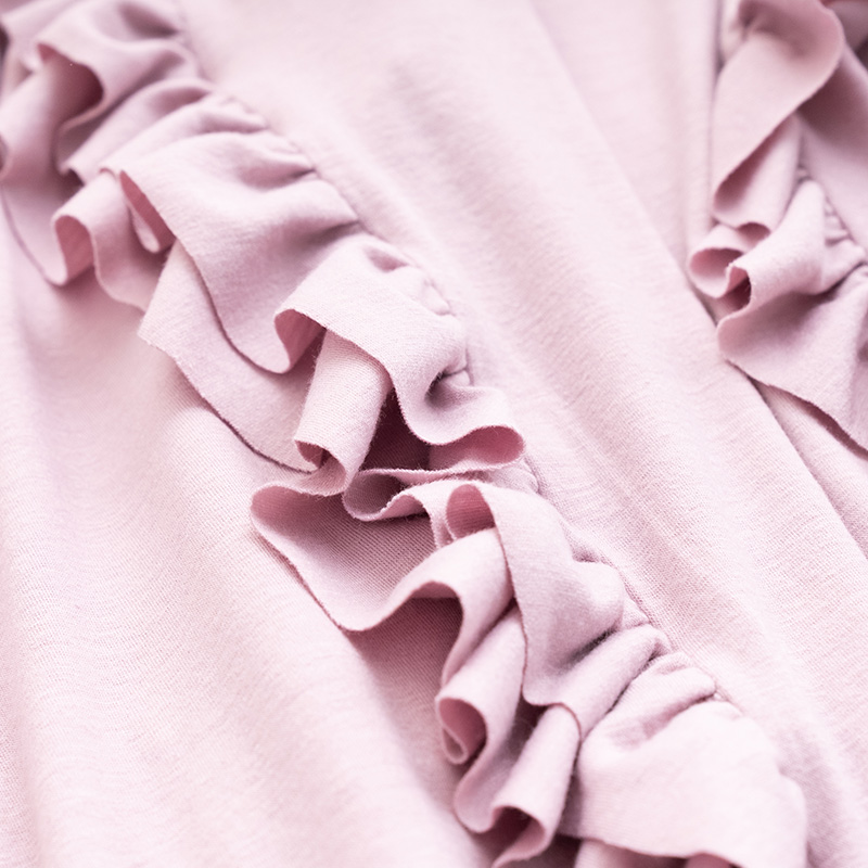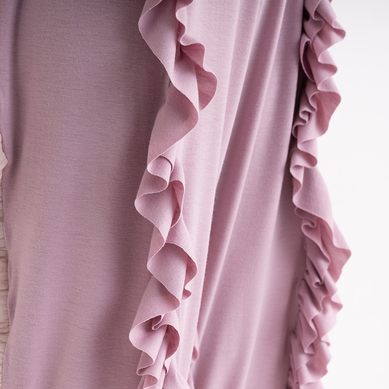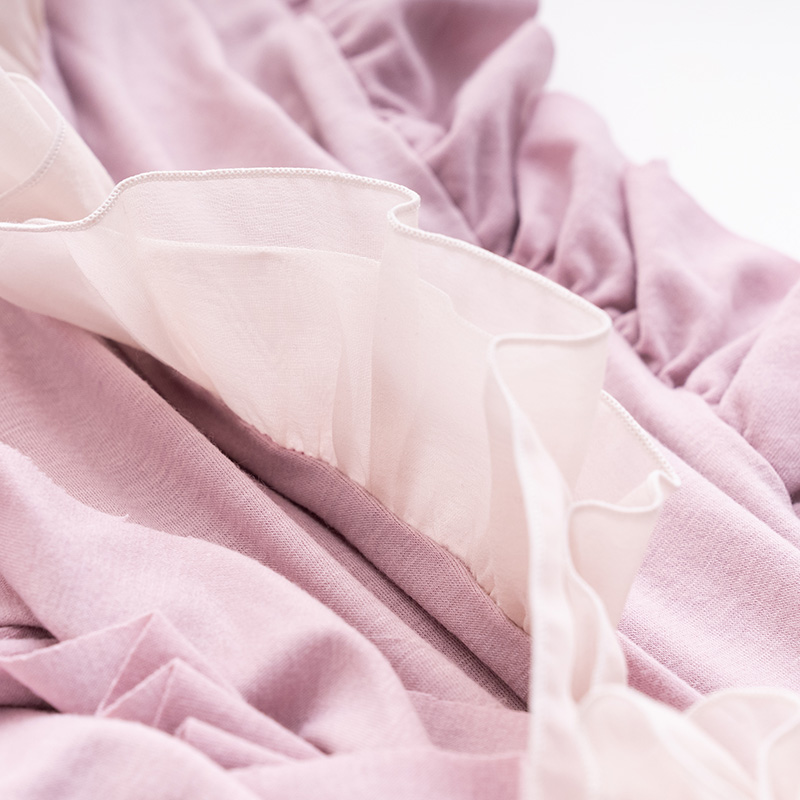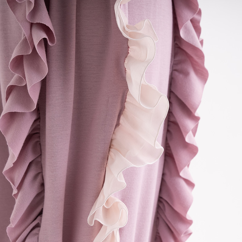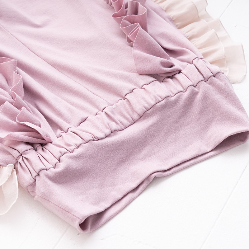着心地の良いベア天竺のゆったりした丸いシルエットのフリルパンツです。センターやサイドにたっぷり施されたベア天竺とオーガンジーフリルがフェミニンで印象的です。裾を絞っているのでスッキリと見せてくれ、ロングTシャツやワンピースとのレイヤードも相性のいいパンツです。リラックスフリルTシャツとのセットアップもオススメです。ウエスト部分の幅広い生地が締め付けが少なくゆったりと快適にお過ごしいただけます。外出にも着用いただけるデザインとなっております。