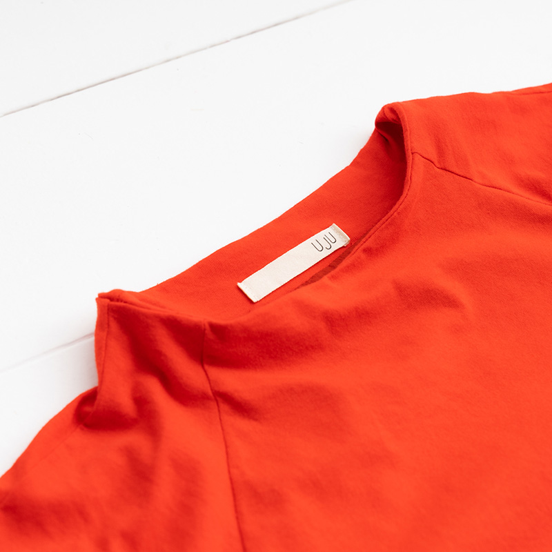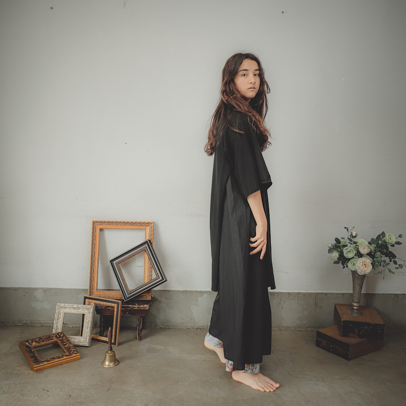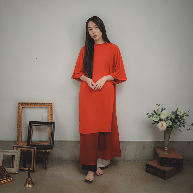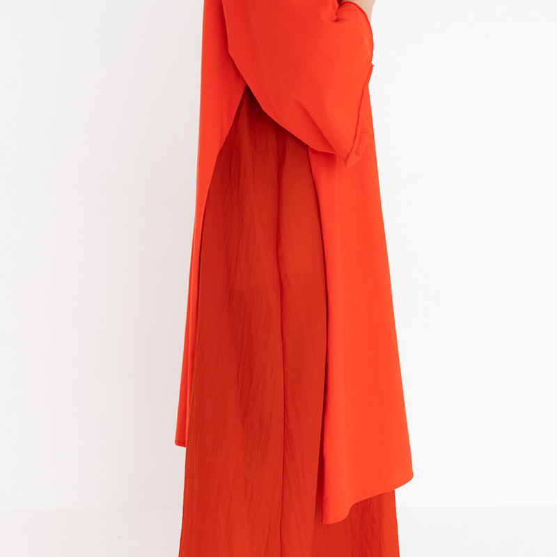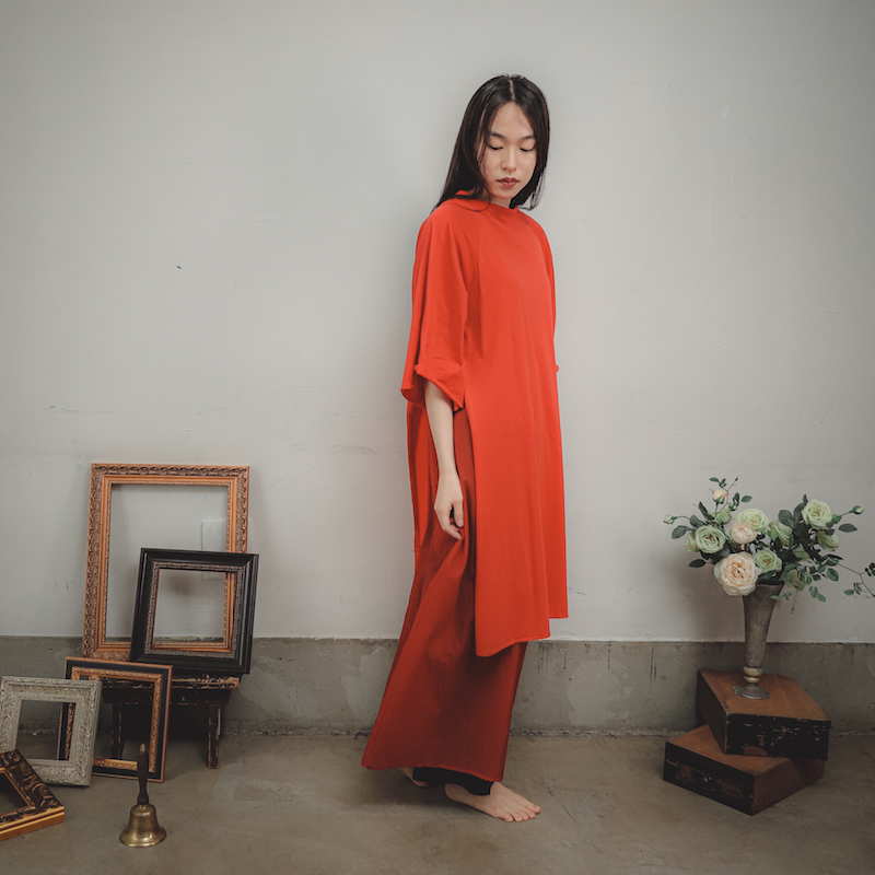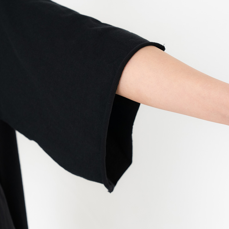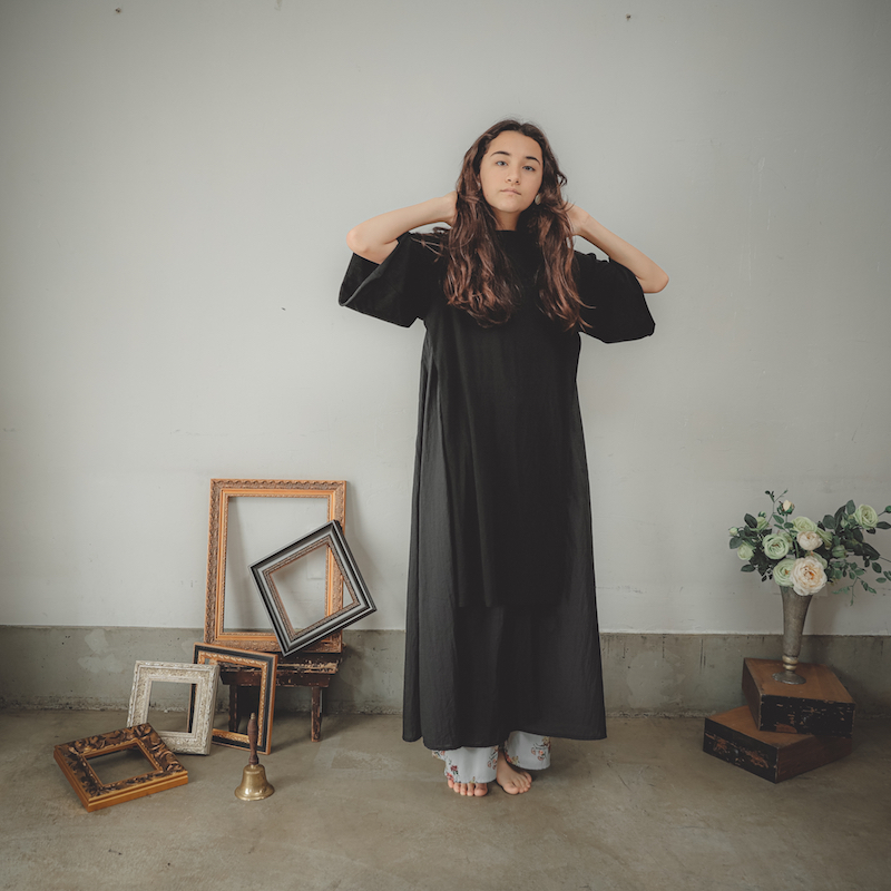 ワンピース全体のAラインとカットソーのIラインのメリハリがはっきりとしていて美しいシルエットになっています。