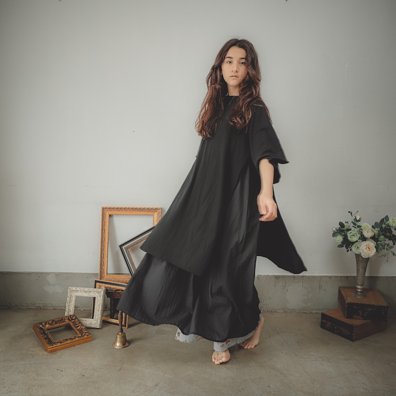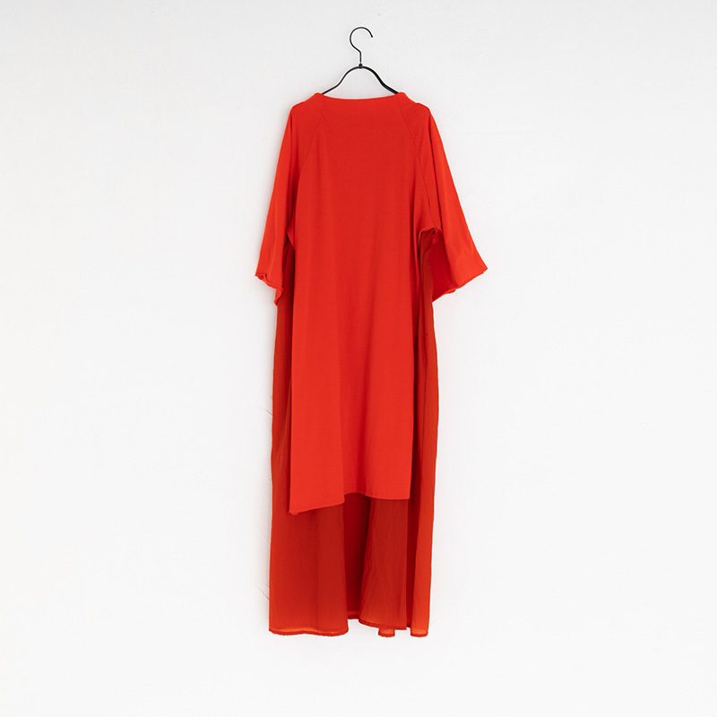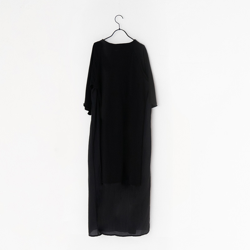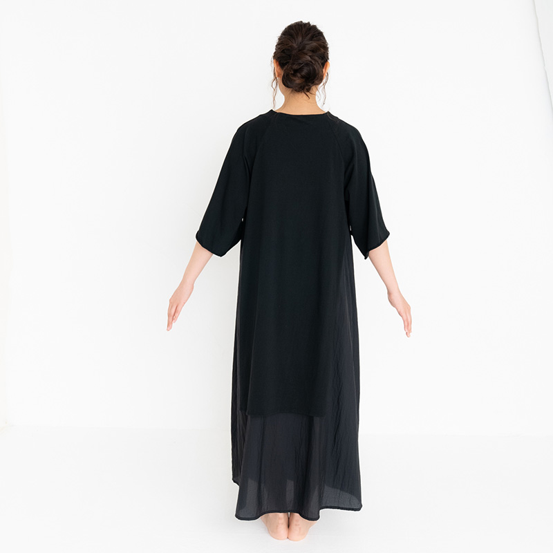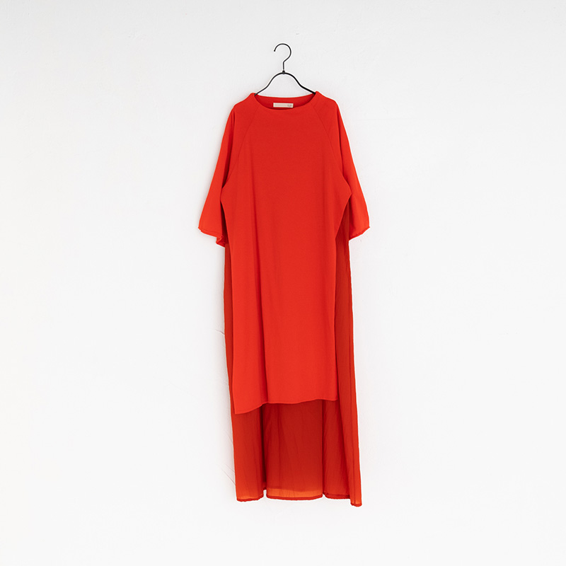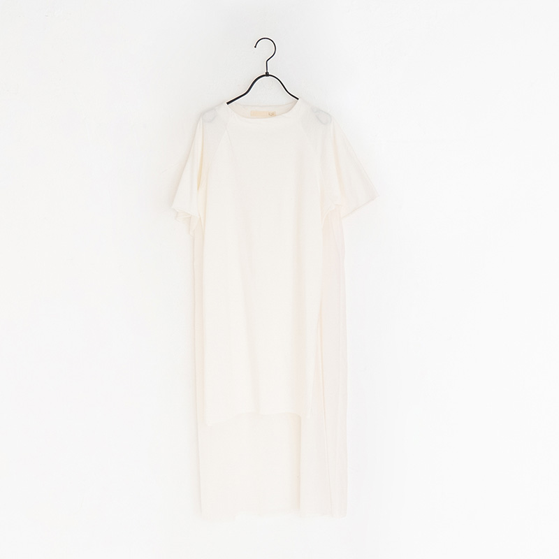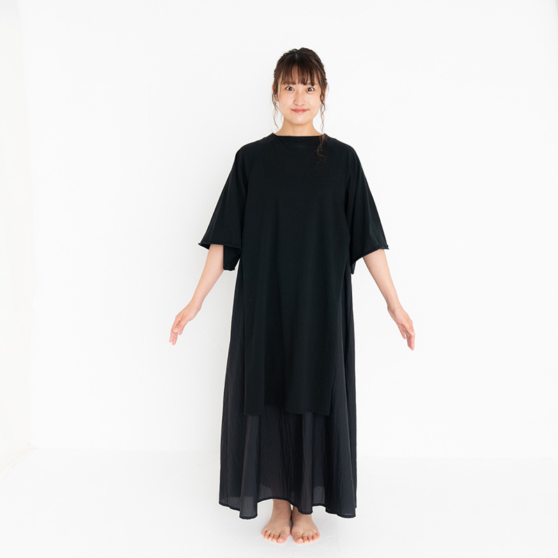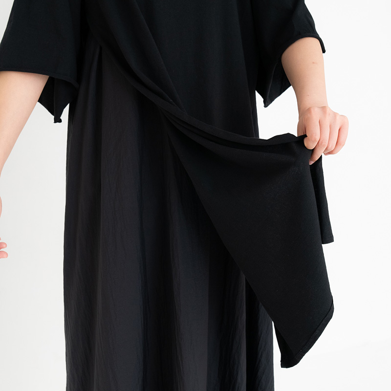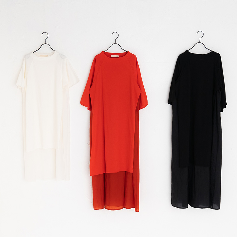 肌触りのよいカットソーとシアー感あるナイロン素材のレイヤードワンピースです。