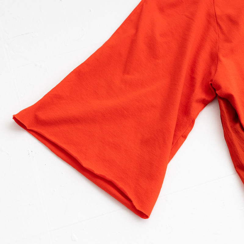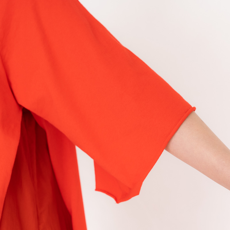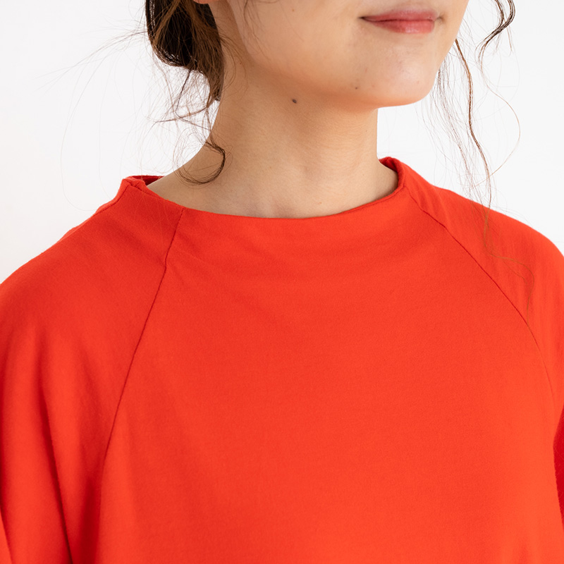 ラグランスリーブは肩が落ちた形状なので肩のラインがはっきり出ず、ボディーラインを目立たなくさせる効果もありリラックス感のある印象に。