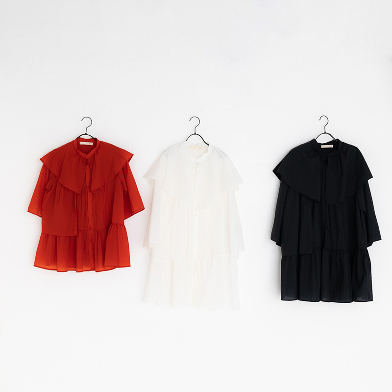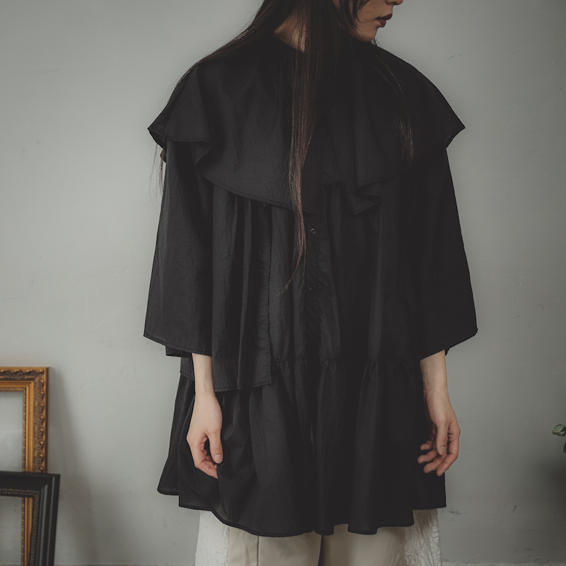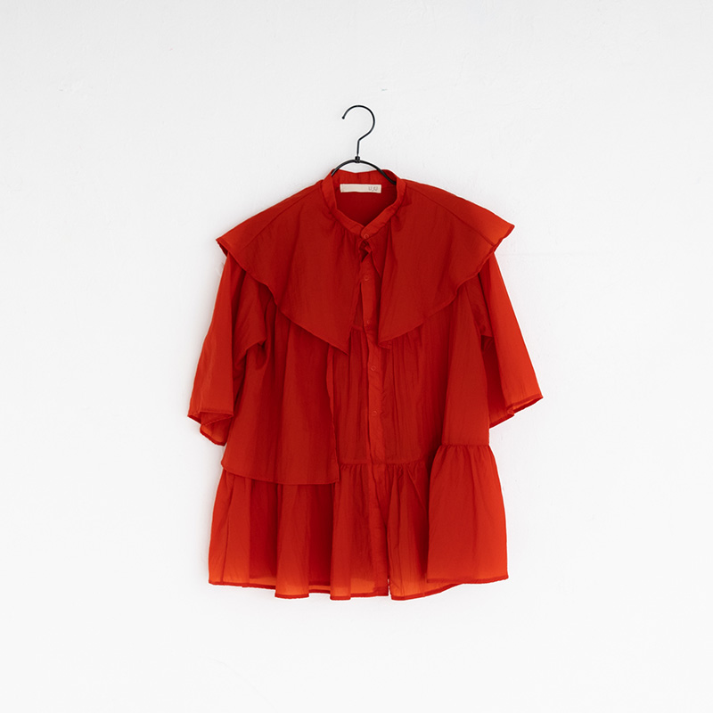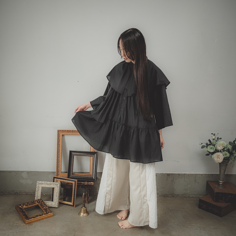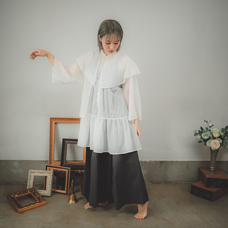 大きな衿がポイントのシアー感あるふんわりAラインのブラウスです。