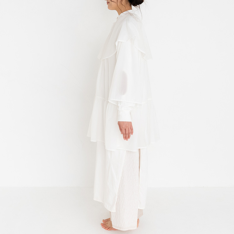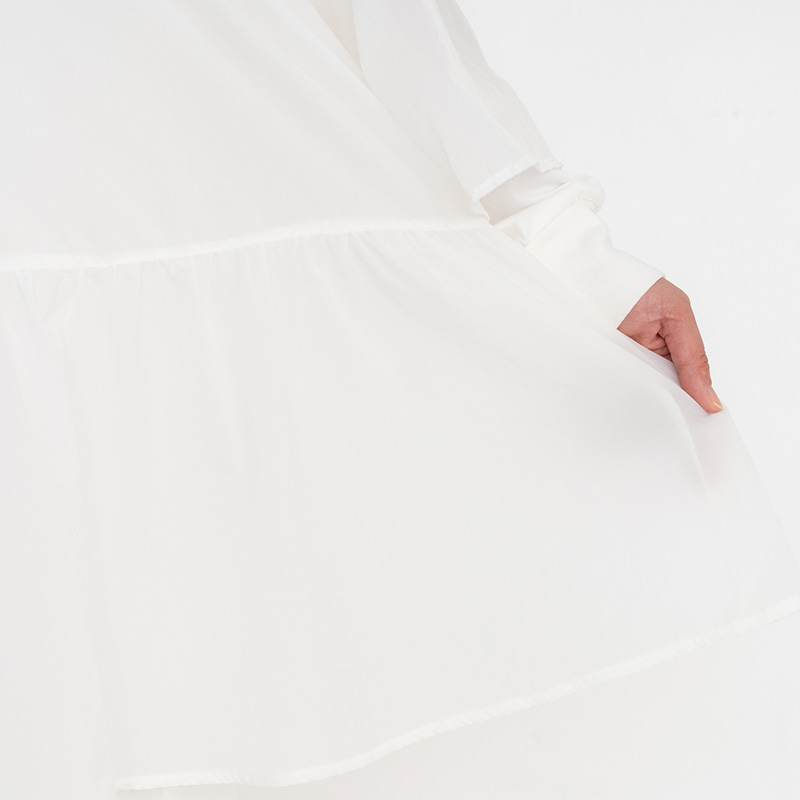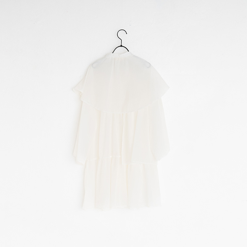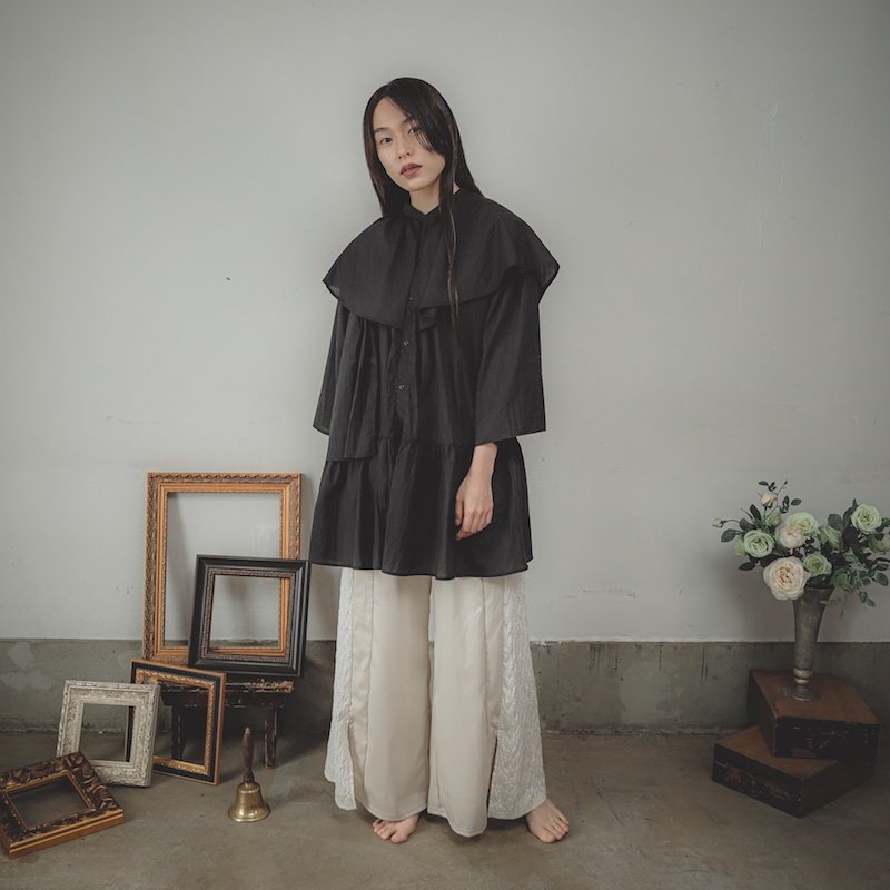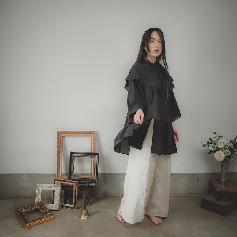 大きな衿がポイントのシアー感あるふんわりAラインのブラウスです。